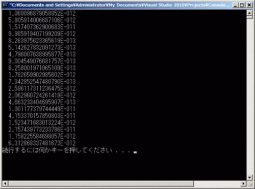半径1の1/4円中に入るか入らないかで円周率を求める古典的な例です。一千万回の試行をしているけれども、組み込み乱数がちゃんとしているかは不明w 試行回数Nに対して、おおむね 1/sqrt(N) に比例して誤差が減るはずなので目安の数字も出力しています。…